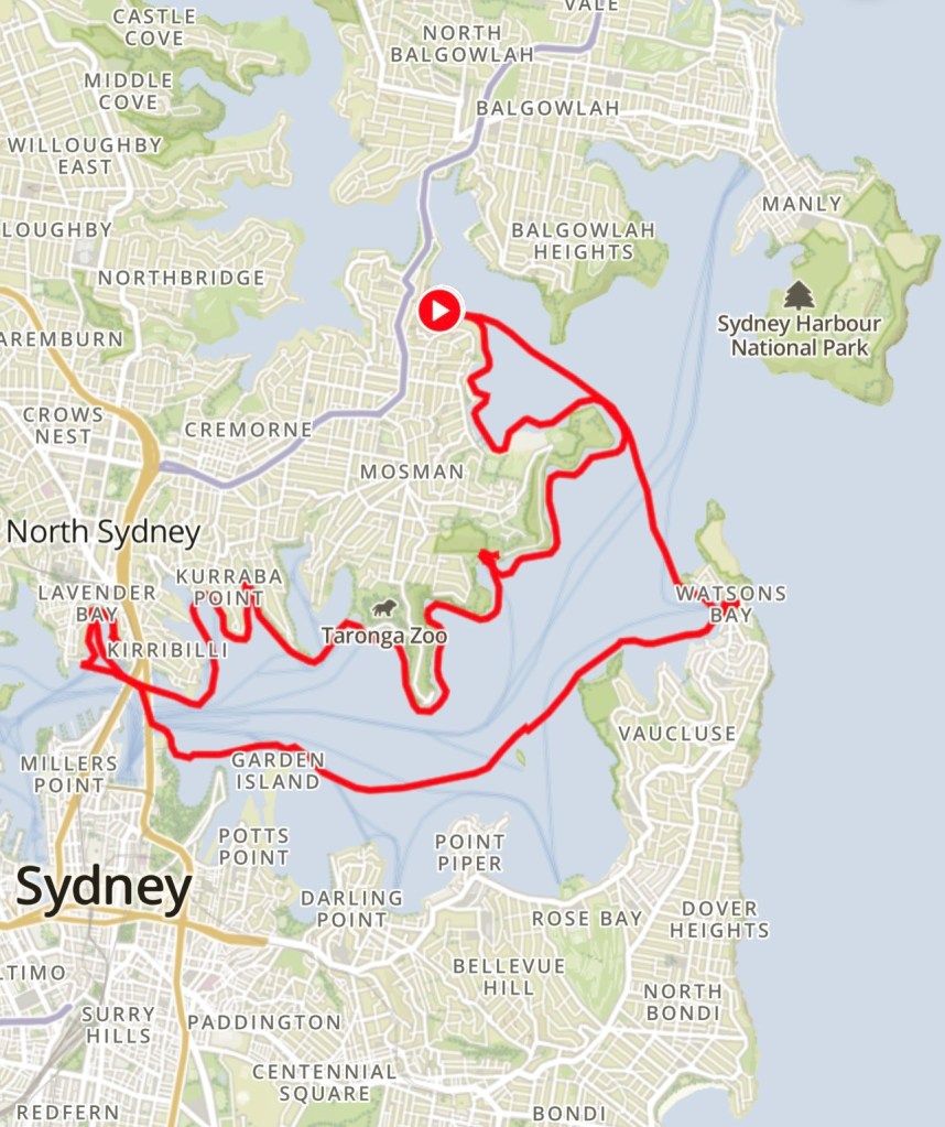 Overall, the tracked route matched our planned route (incl. for distance, about 35km), except for the shoreline route around Taronga and Neutral Bay that was in lieu of the planned final run back to the put-in point from South Head – we instead turned for home at Watsons Bay.