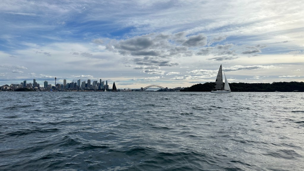 At about this time the clouds had started to roll in, and the forecast wind started to step up to its commitment to making our day a whole lot more challenging. The harbour is open and exposed to the wind and the 16kt westerly coming straight at us from under the Harbour Bridge itself used the long ‘fetch’ to create some small whitecaps that combined with the wash of many large boats to give us a bumpy ride in to our mid-point destination.